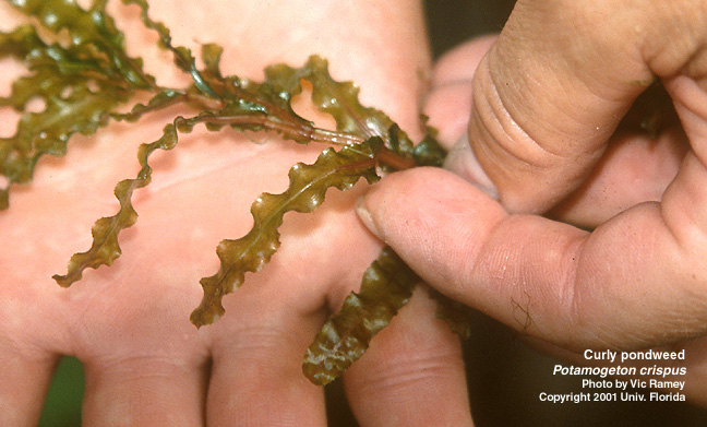 Curlyleaf pondweed has distinct lasagna looking leaves. It spreads by hardy seed pods called turions that fall off the plants early towards the middle of the summer.