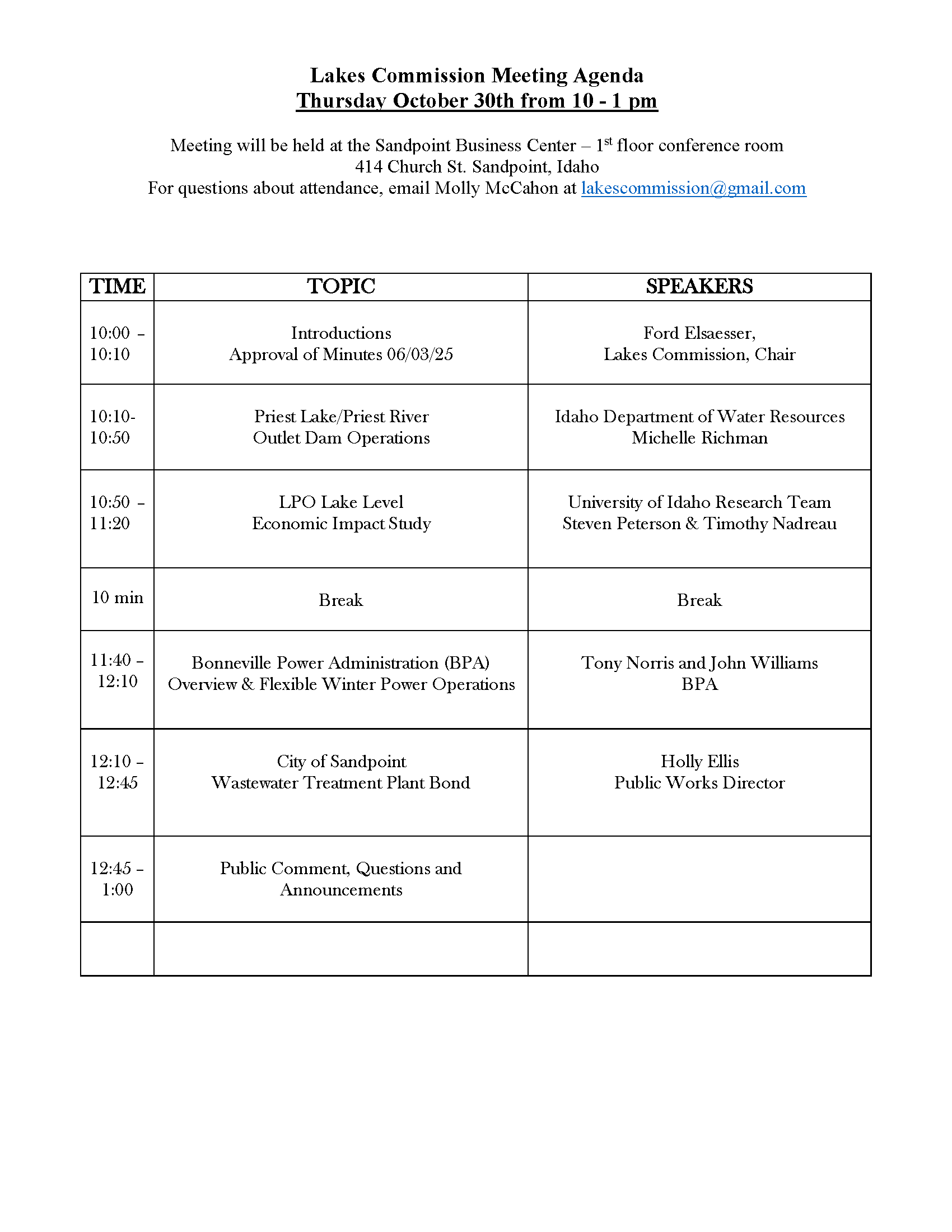 We hope you will be able to join us for our Fall meeting on Thursday October 30th from 10 – 1 pm. Come for the whole thing or just arrive for your topic of choice. This will be an in person only meeting without a virtual option.. because we would rather see you in person of course! At this point in time, the USACE will not be able to provide an update on Albeni Falls Dam during this meeting. If and when we receive an email update we will send that out.