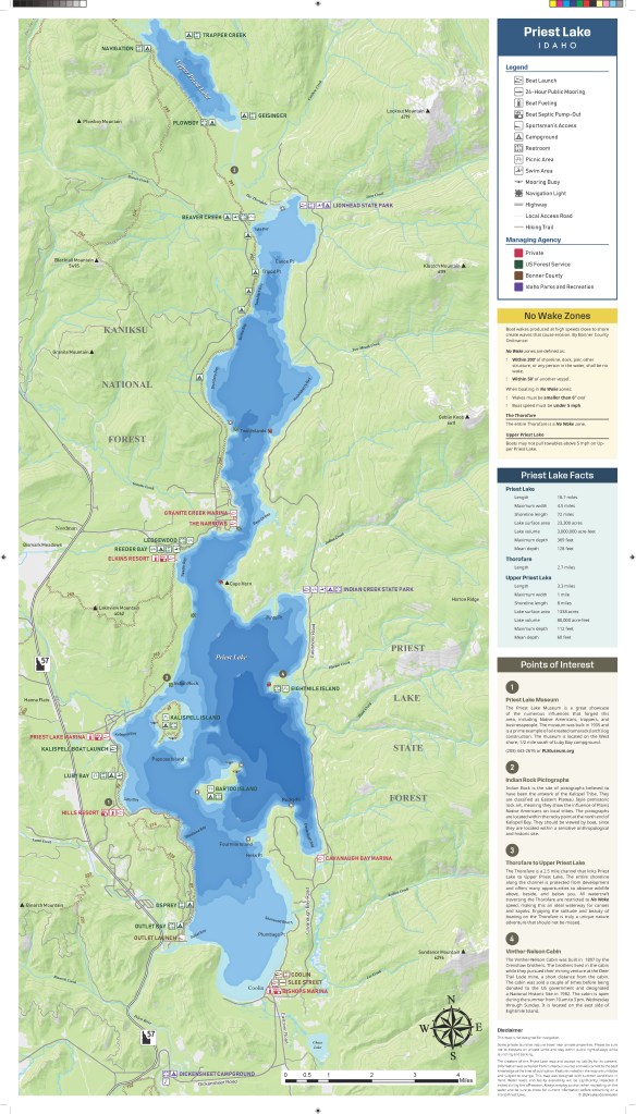 The summer recreation level of Priest Lake is around 2,437.70 feet above sea level and measures 3 feet on the gauge at Outlet Dam, which controls the lake levels. Outlet Dam is managed by the Idaho Department of Water Resources.